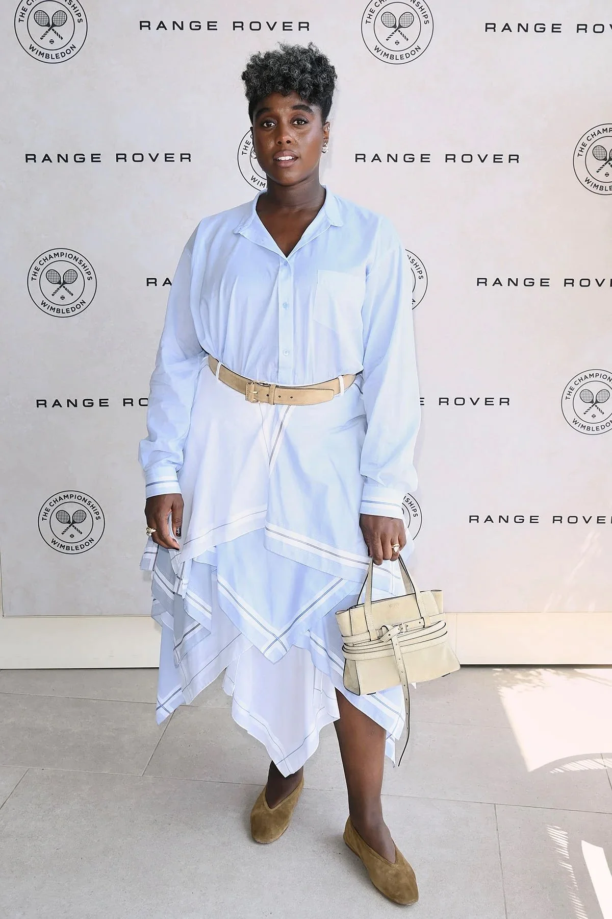 Actress Lashana Lynch delivered a fresh take on ‘Wimbledon Whites’ in a shirt dress with a layered handkerchief skirt, belted at the waist and paired with suede flats. Clean, crisp, with a textured twist — we’re into it.